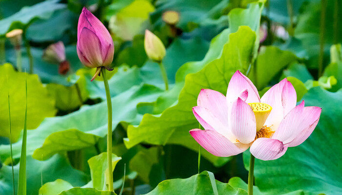 四大国花之一荷花,属于毛莨目睡莲科,也叫莲花、水芙蓉等。荷花底下根茎长而肥厚、有长节,叶子呈盾圆形。花期为每年的六月到九月份,花瓣多数,嵌生在花托穴内,有红、粉红、白、紫等花色。