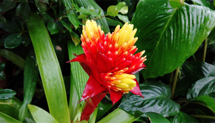 鸿运当头花名为凤梨花,学名:大花红星,属凤梨科,是冬、春季室内观赏花卉,四季常绿,花序美丽多姿,色彩丰富,常见栽培的有大红、粉红、金黄、玫红等品种。
